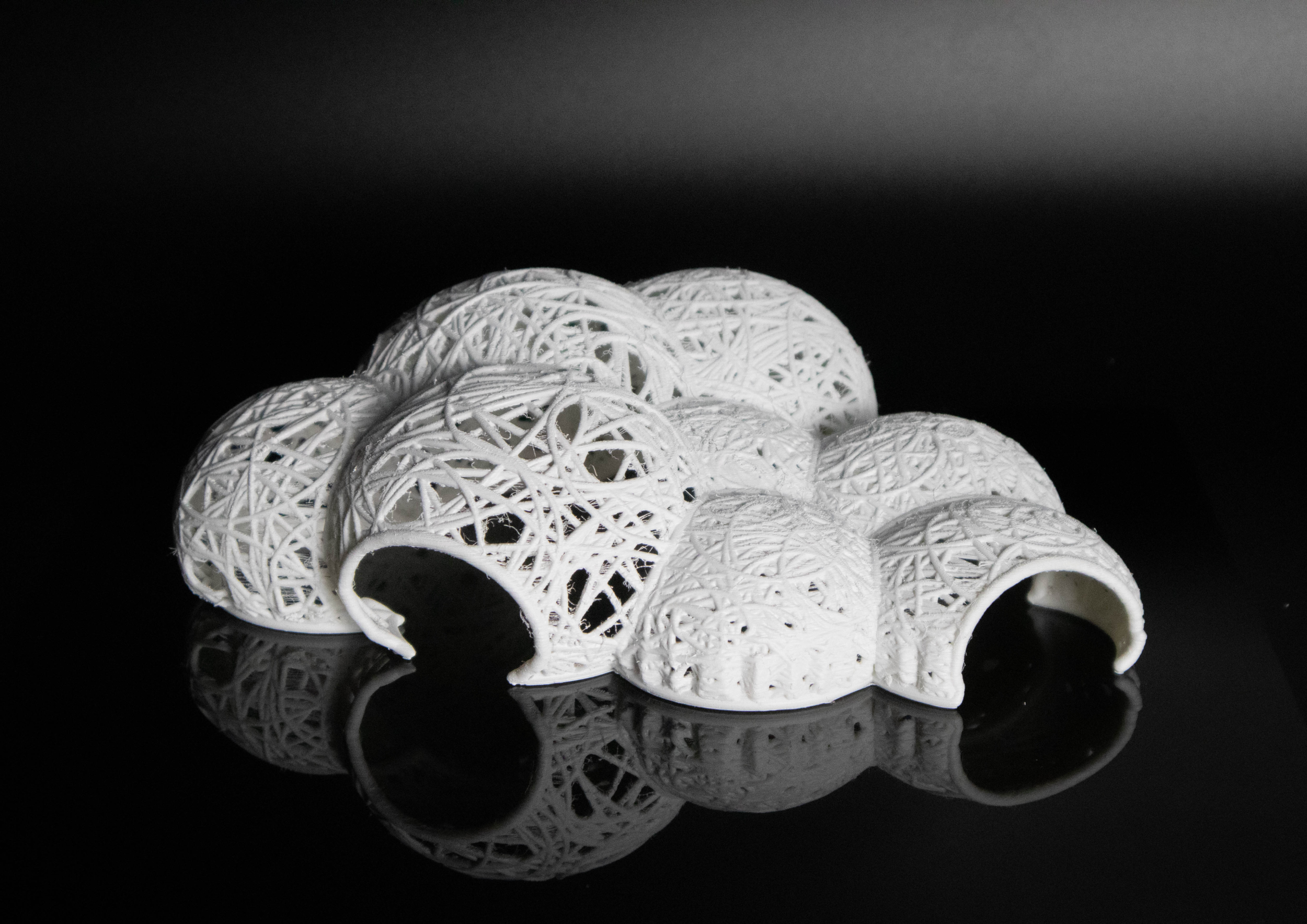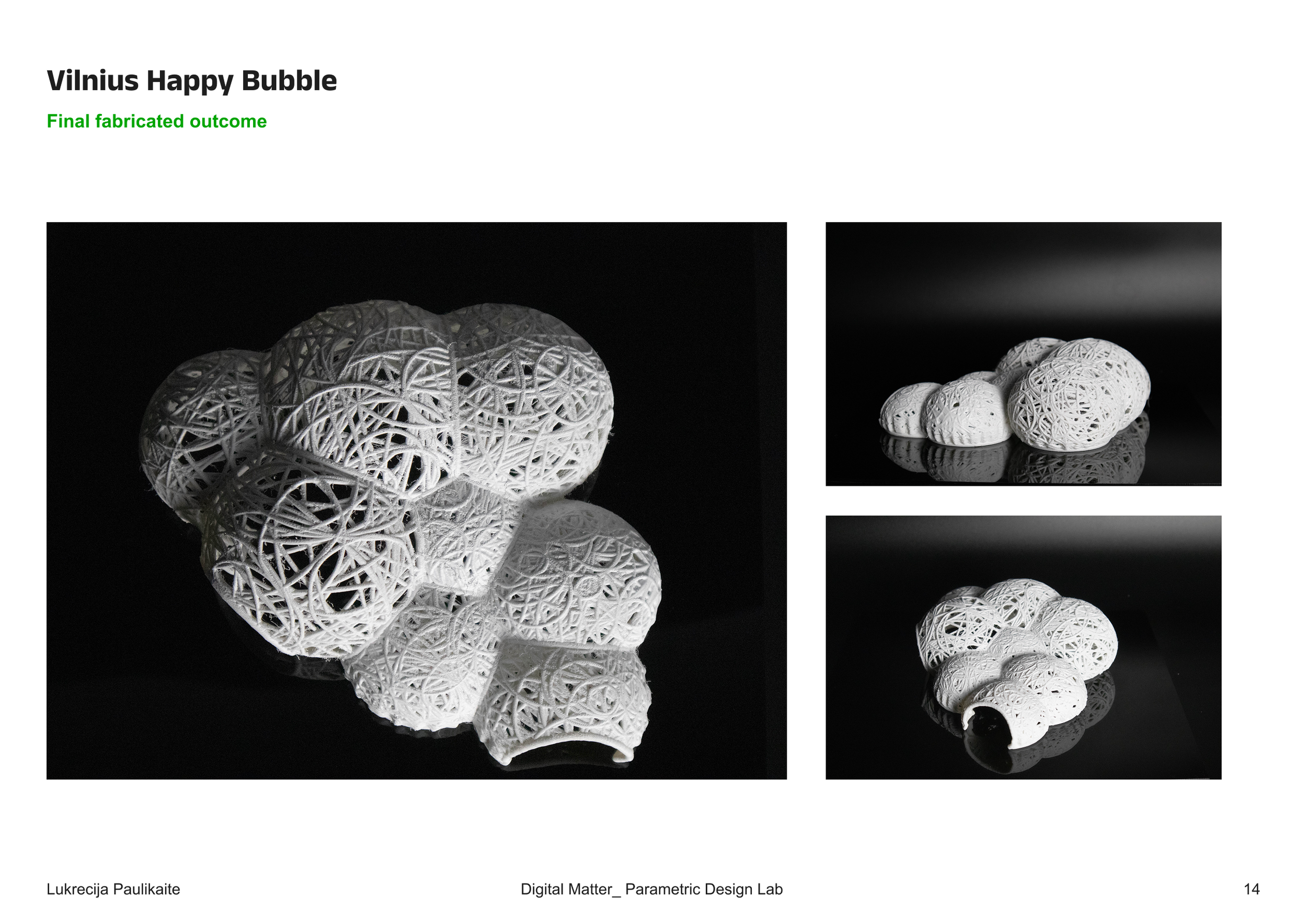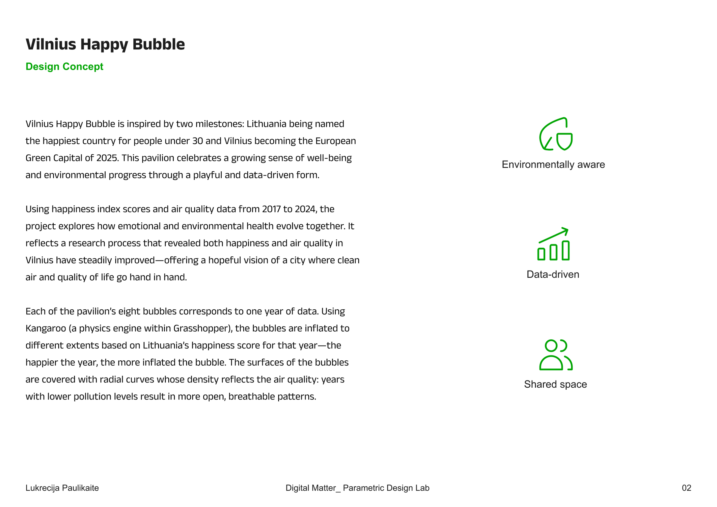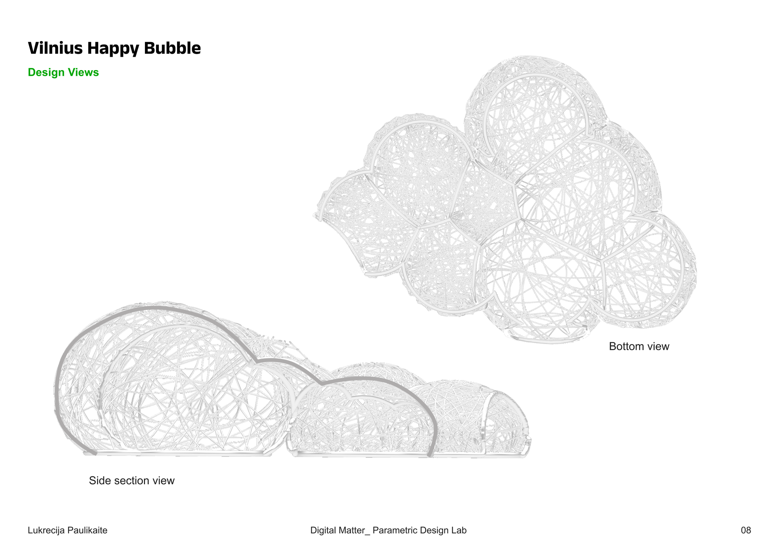 Each of the pavilion’s eight bubbles corresponds to one year of data. Using Kangaroo (a physics engine within Grasshopper), the bubbles are inflated to different extents based on Lithuania’s happiness score for that year—the happier the year, the more inflated the bubble. The surfaces of the bubbles are covered with radial curves whose density reflects the air quality: years with lower pollution levels result in more open, breathable patterns.