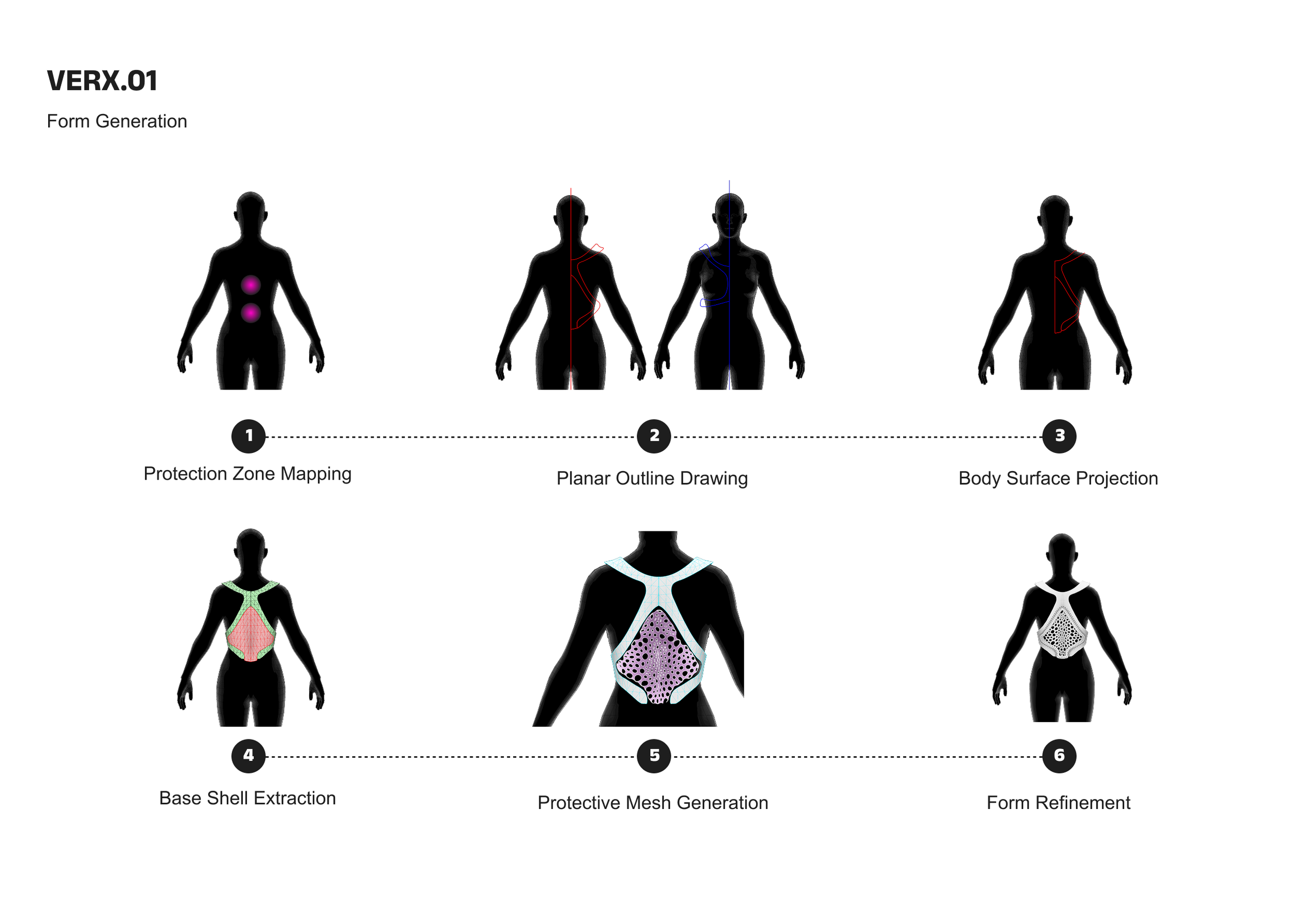 Beyond its technical function, the project responds to a gap in sports fashion: the lack of protective gear that feels empowering rather than restrictive. Traditional spine guards are often bulky, unflattering, and designed without consideration for aesthetics or gendered fit. This design aims to move beyond rigid forms, offering protection that feels sculptural, elegant, and wearable. By combining performance with a fashion-forward aesthetic, the piece fosters confidence in athletes - not just through safety, but through a sense of self-expression and pride in their gear.